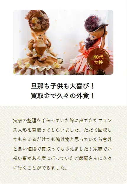 - 独自の販売ルートを豊富に保有しているため、他店で断られた人形でも買い取ってもらえる可能性あり