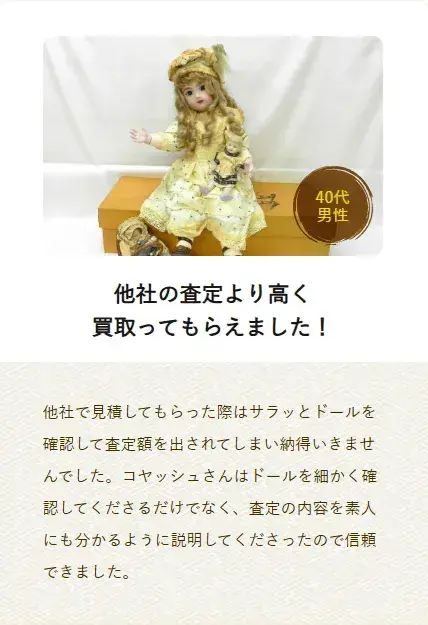 他店で断られたり、価値が分からない人形を1点からの査定希望でも出張してくれるコヤッシュ。