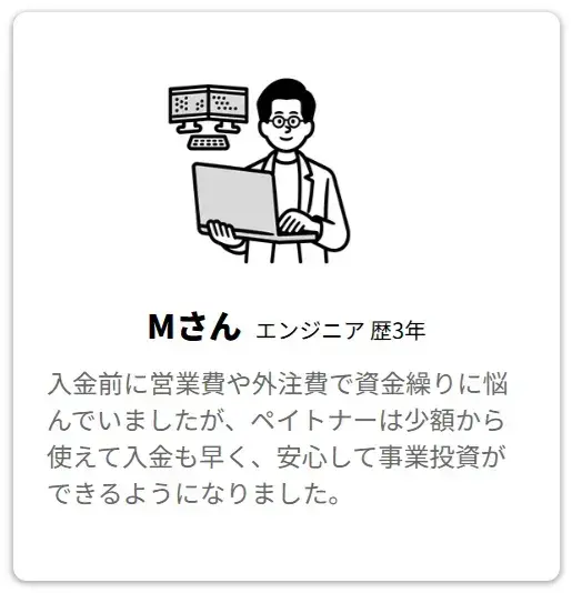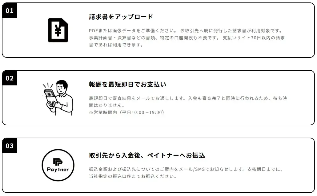 また、ペイトナーはファクタリング会社の中でも珍しく、個人顧客との間に作られている売掛債権でも資金調達が可能です。