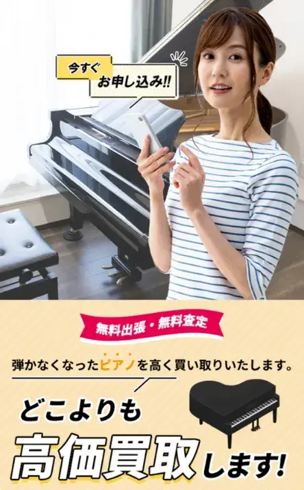 アップライトピアノ、グランドピアノ、電子ピアノ、古い/使わないピアノ、故障・傷のあるピアノ、重くて運べないピアノなど、どんなピアノでも高価買取してくれます。