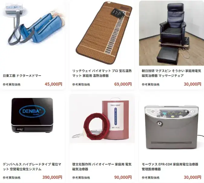 父が使っていたマッサージ機や健康器具を買い取っていただきました。 数年間使わずに部屋の隅に置いたままでしたが、家の片付けを進める中で処分を検討していたところ、ご紹介いただきました。 丁寧に査定していただき、動作しない機器もいくつか無料で引き取ってもらえたので、とても助かりました。