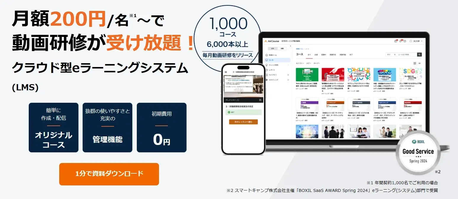 受け放題の動画研修がついたeラーニングシステムのAirCourse(エアコース)。受講者/管理者の使いやすさをとことん追求したシステムで誰でも直感的に操作できます。