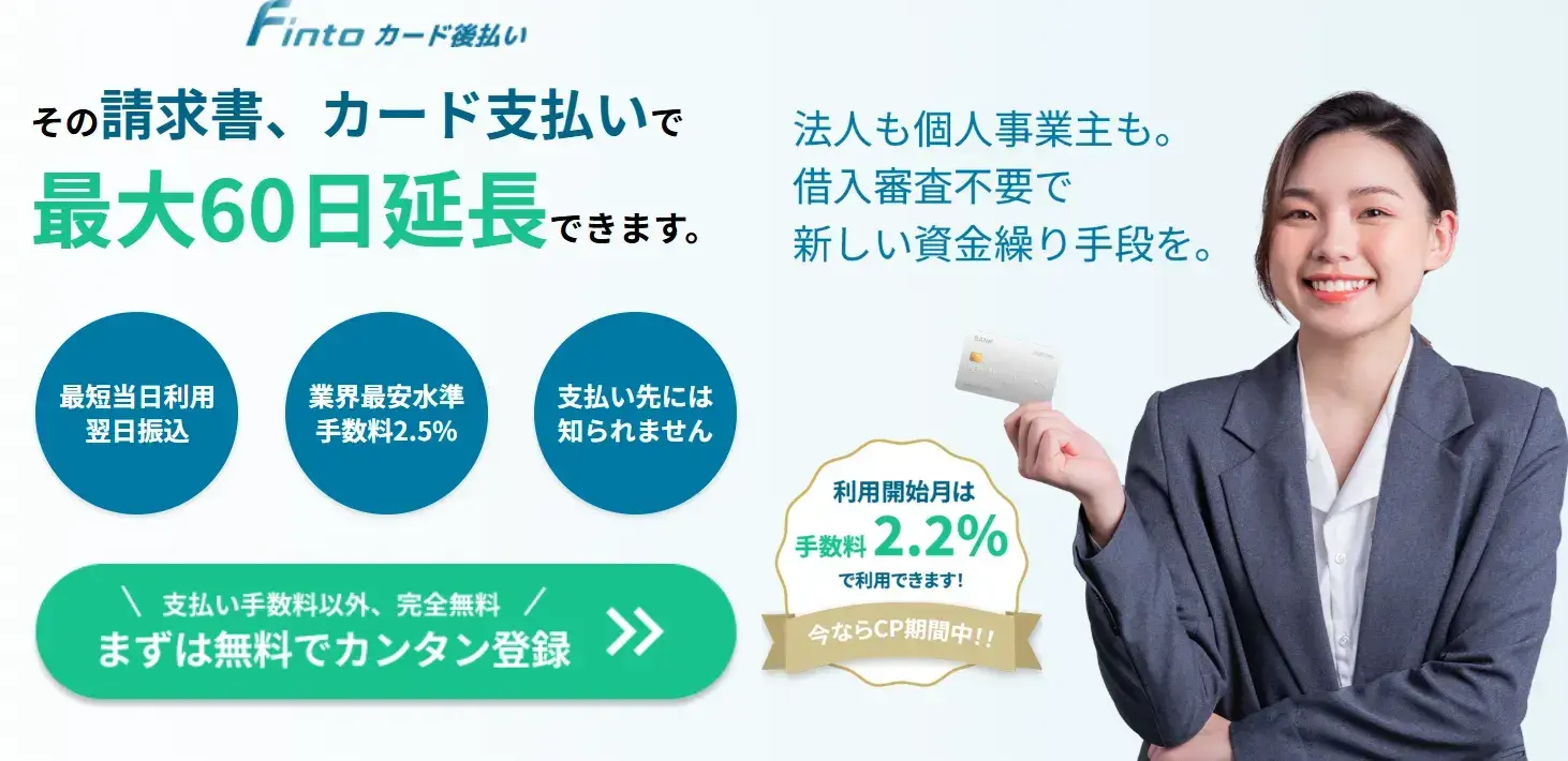- 3社会保険料にも対応 手数料が2.5%※と業界最安水準の「Fintoカード後払い」。