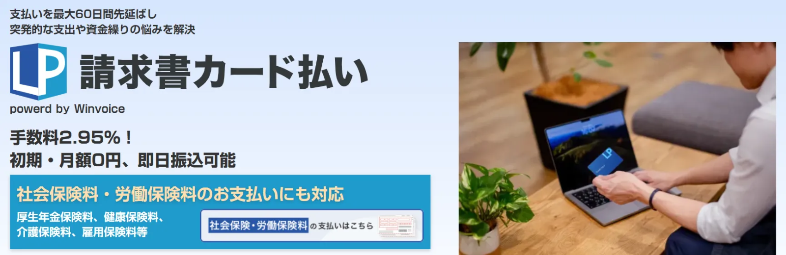 - 2社会保険料・労働保険料の支払いにも対応 手数料が2.95%と業界最安水準※の「LP請求書カード払い」。
