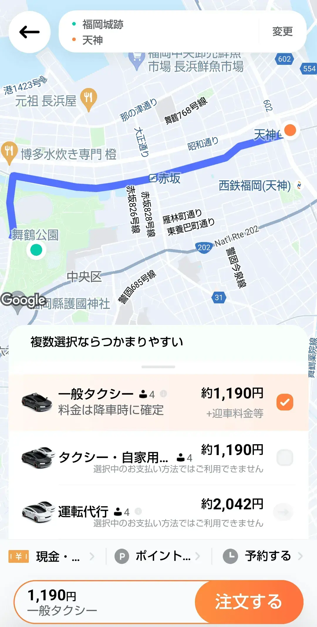 アプリを起動後、目的地を入力するとすぐ乗れるタクシーが表示されます。